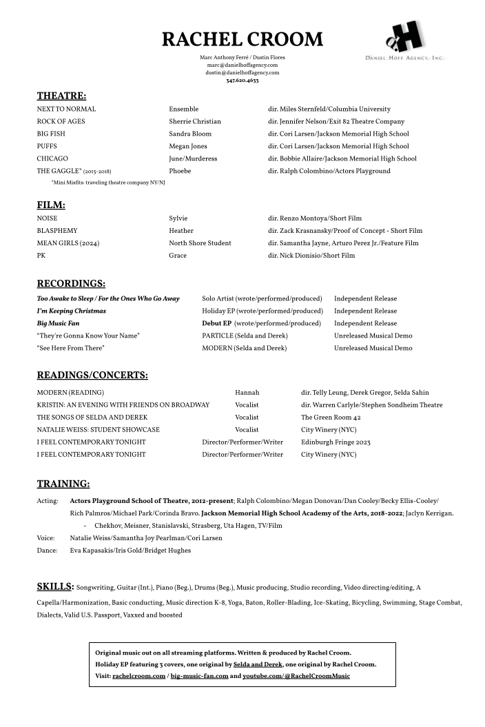 Actress, performer, and singer-songwriter Rachel Croom grew up in Jackson, New Jersey. She began acting at the age of nine and attended Actors Playground School of Theatre in Freehold, New Jersey. Acting credits include the short film "Blasphemy," in which she played Heather (2024), "Mean Girls," as a North Shore Student (2024), and the short film "PK," where she played Grace (2023). She has also performed in various theatre productions.